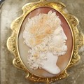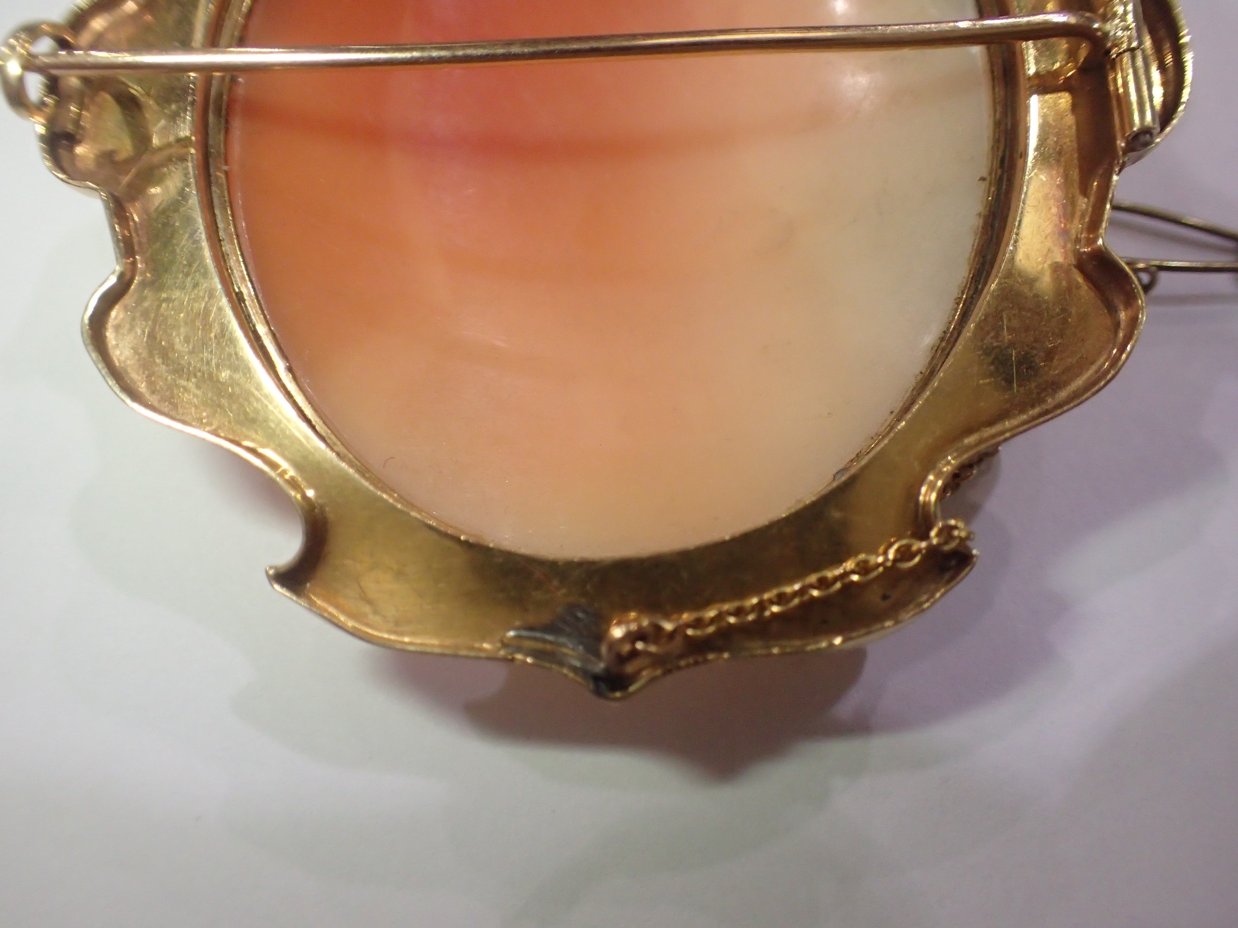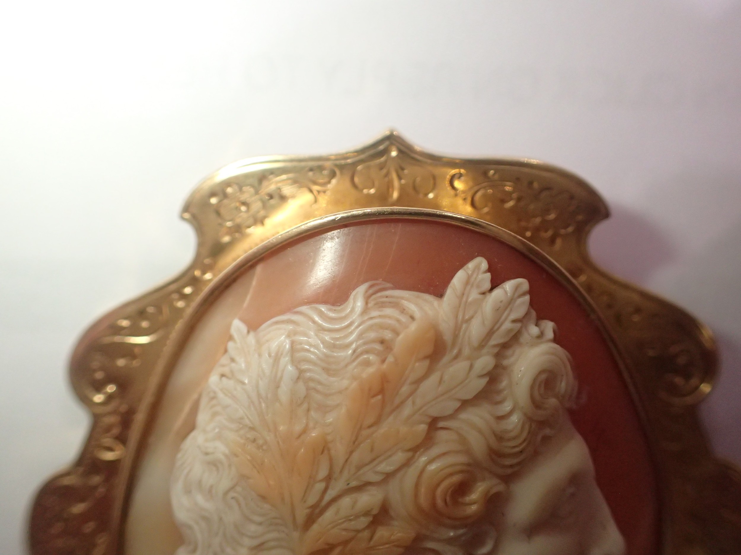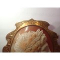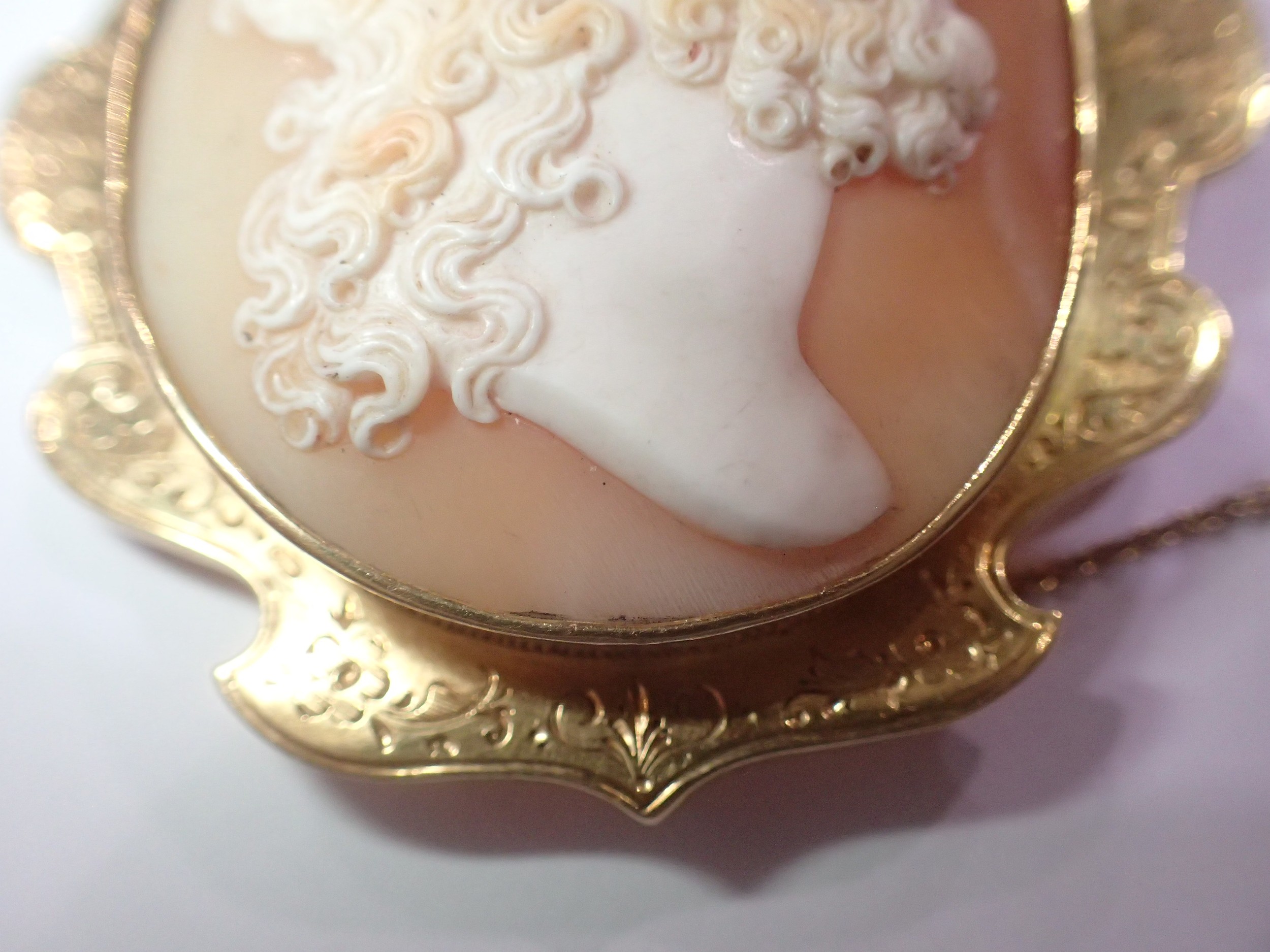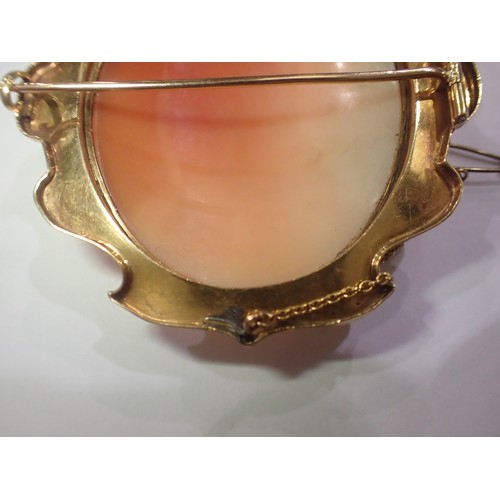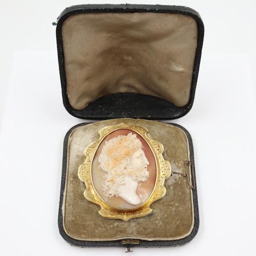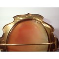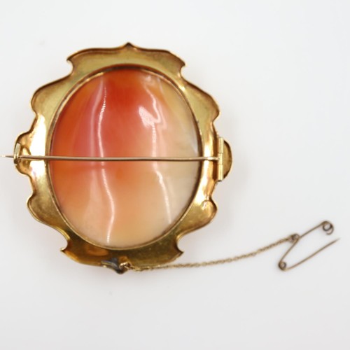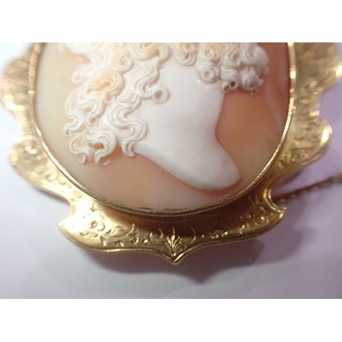 A fine carved large shell cameo portrait, set within an unmarked 14ct scalloped brooch mount, cameo 45 x 50mm (crack to cameo), overall 60 x 65mm, 21.6g. UK P&P Group 0 (£7+VAT for the first lot and £1+VAT for subsequent lots)